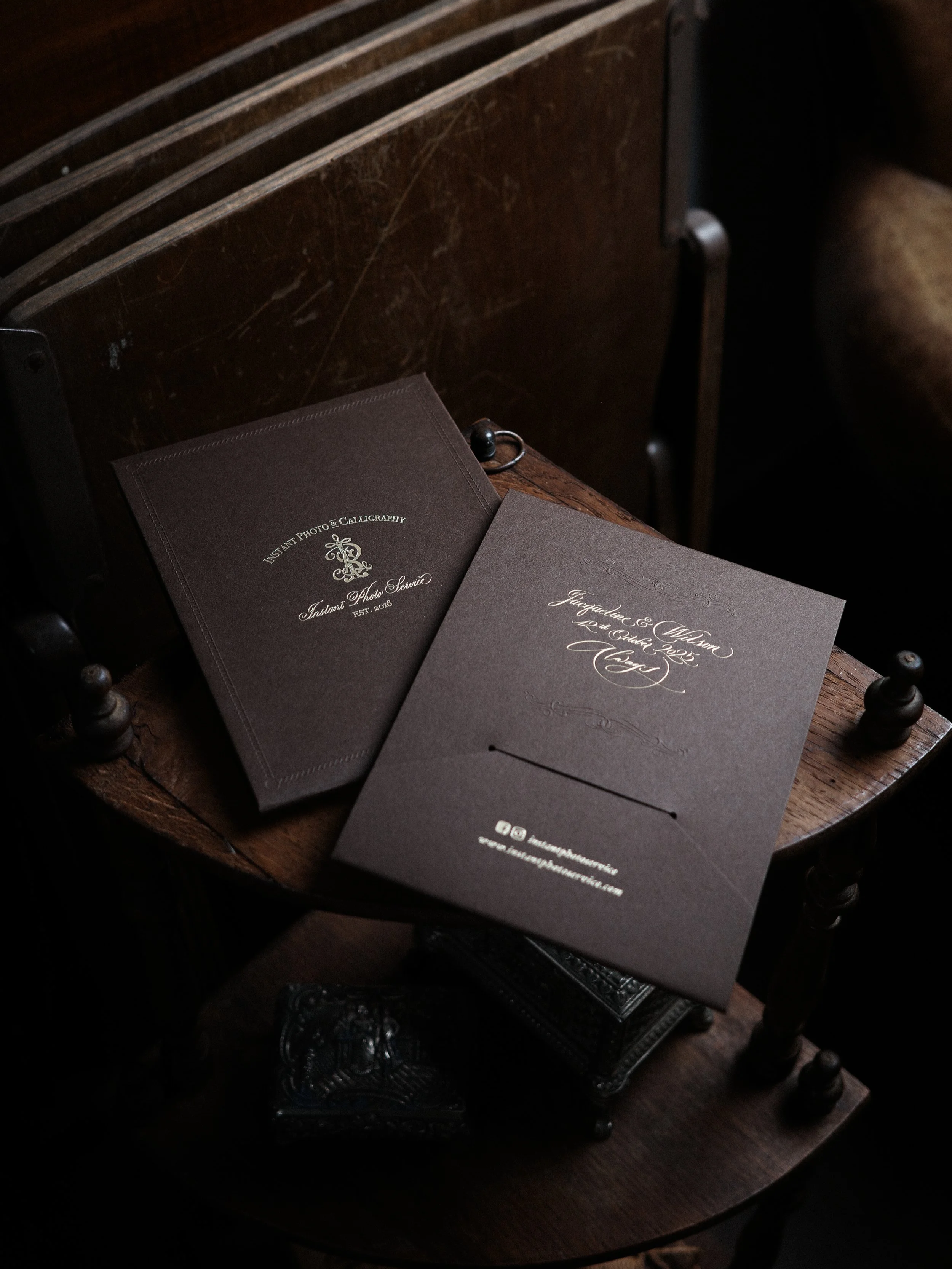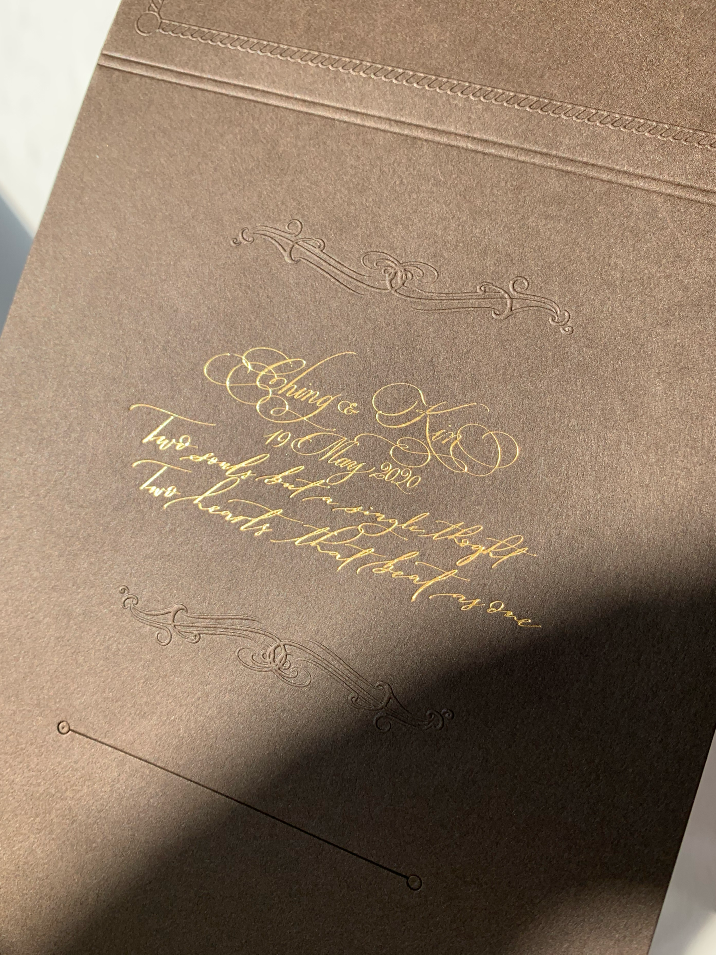 西洋書法字句會製作模版,再以手工燙金印製於相套背面,另外亦可補上手續費加印一版於正面 [ + HKD 600 ]。